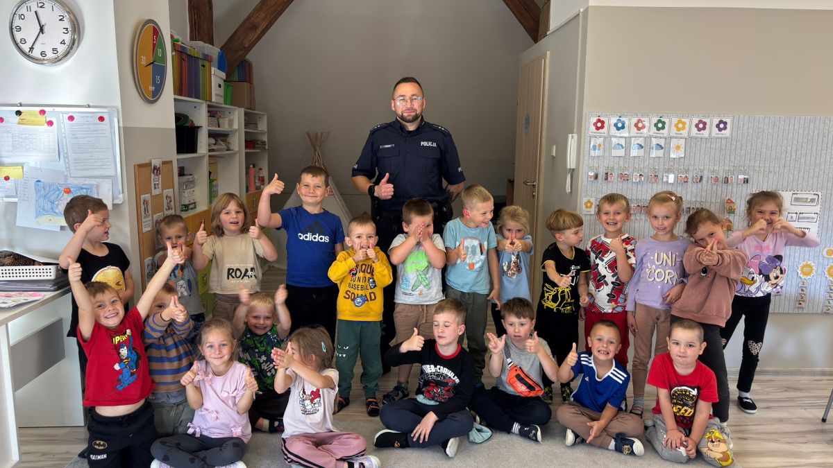 Policjant z grudziądzkiej komendy przeprowadził zajęcia w przedszkolu w Małym Rudniku. Przypomniał dzieciom jak bezpiecznie poruszać się po drodze, jak reagować w kontaktach z nieznajomymi oraz jak zachować się w towarzystwie psa.