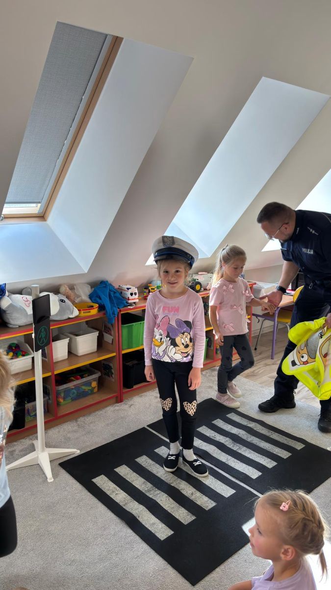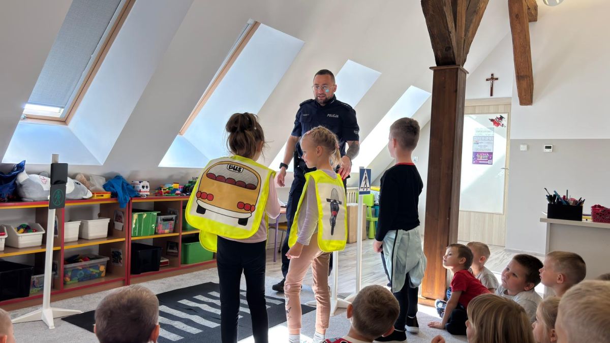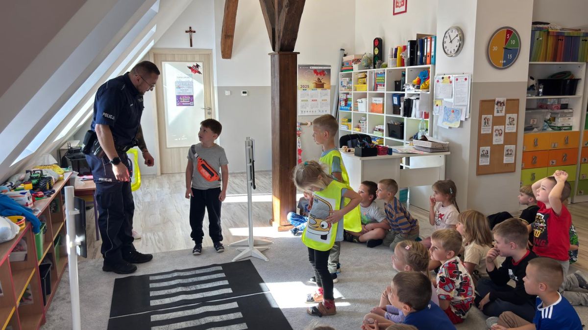 Dzieci z zainteresowaniem słuchały, jak należy bezpiecznie przechodzić przez jezdnię, jak rozpoznawać sygnalizację świetlną i dlaczego zawsze trzeba korzystać z pasów. Policjant przypomniał również, że w drodze do przedszkola należy być ostrożnym, zwracać uwagę na pojazdy i zawsze iść chodnikiem.