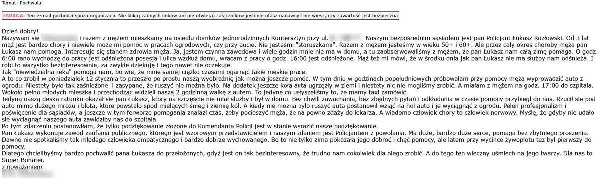 Zdecydowali się skierować swoje podziękowania do przełożonych funkcjonariusza, podkreślając, że jest on wzorowym przedstawicielem zawodu zaufania publicznego.